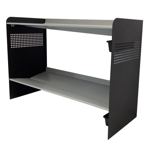 RAKABOT Signature 2 tier chic and classy water and mud collecting shoe and boot rack that stores 7 pairs. Powder coted grey shelves. Powder coated mate black side panels. For a perfect entrance all year long. Made In Canada Invention.